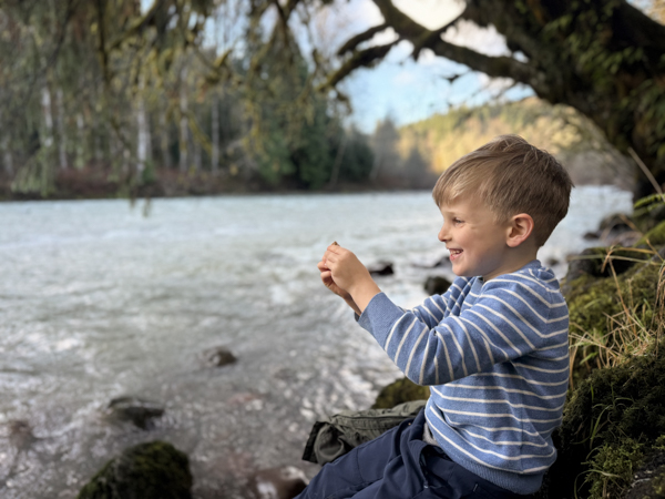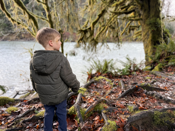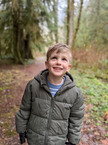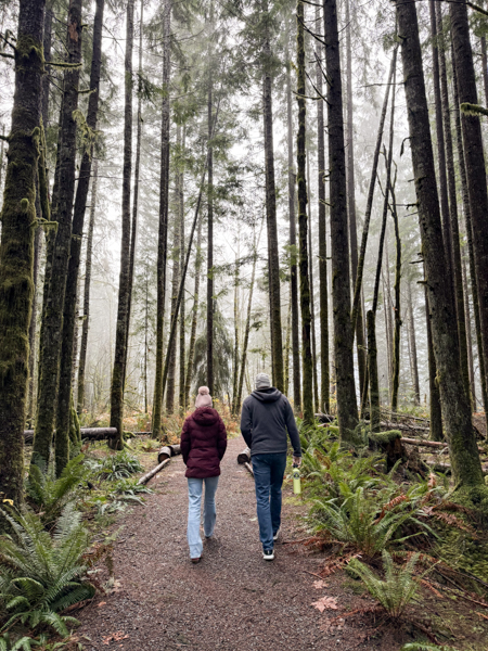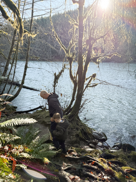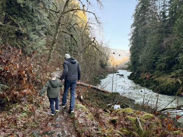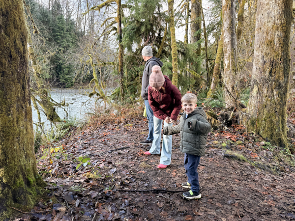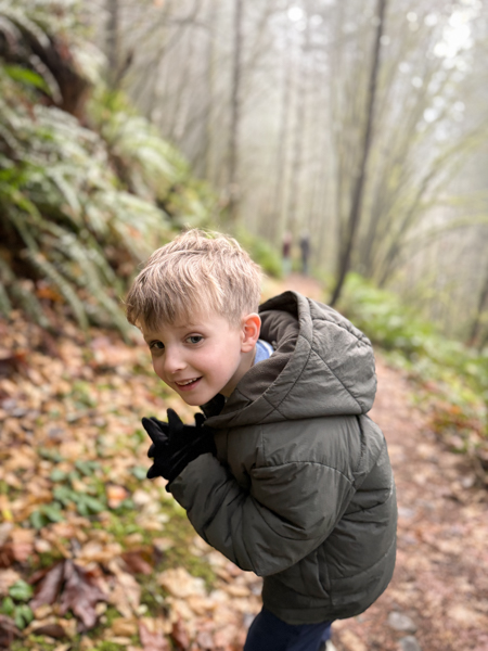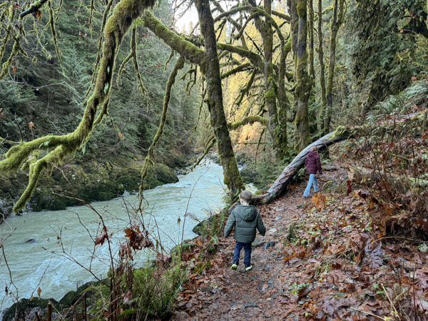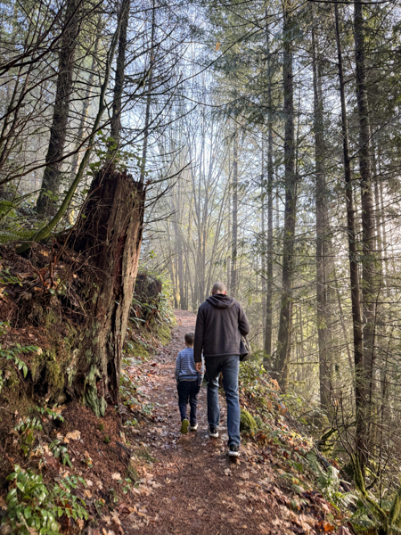We spent the day after Thanksgiving (November was rich, too!) walking through the misty woods at Old Robe Canyon in Snohomish. It was hard for me to forfeit our annual trek to the North Bend tree farm when we bought our fake Christmas tree a couple of years ago, but we’ve instituted a winter hike in its place and this trail was perfect. Not too steep, not too long, a scenic place to rest mid-way for a snack…it checked all the family-friendly boxes.