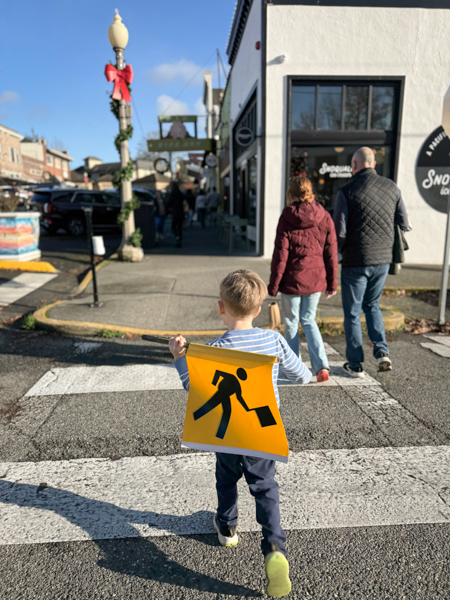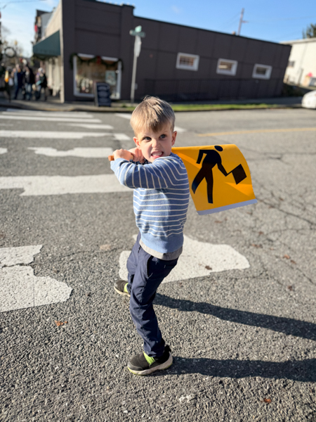 The main street has flags at each intersection that people can carry across for pedestrian safety. Isaac temporarily declared himself the town crossing guard and took his job very seriously.