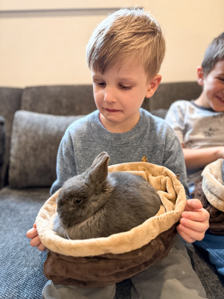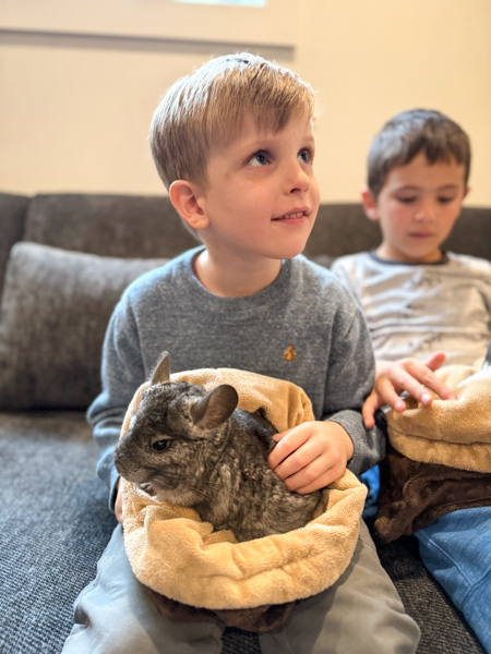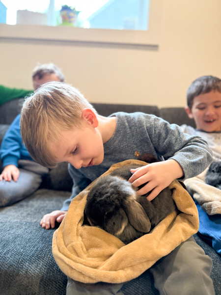 Isaac was invited to a birthday party in which the main event was a cuddle-sesh with bunnies and guinea pigs and chinchillas and oh, my boy…while all the other boys squealed with delight, he wasn’t sure what to make of this furball being plopped on his lap.