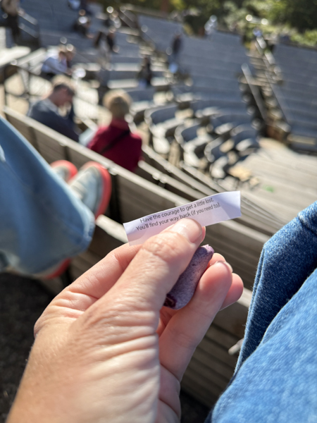 Juliette and I rested our feet at the park’s amphitheater and cracked open the couple of fortune cookies that had been part of our welcome package at the hotel. My fortune opened with, “Have the courage to get a little lost…” Challenge accepted.