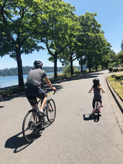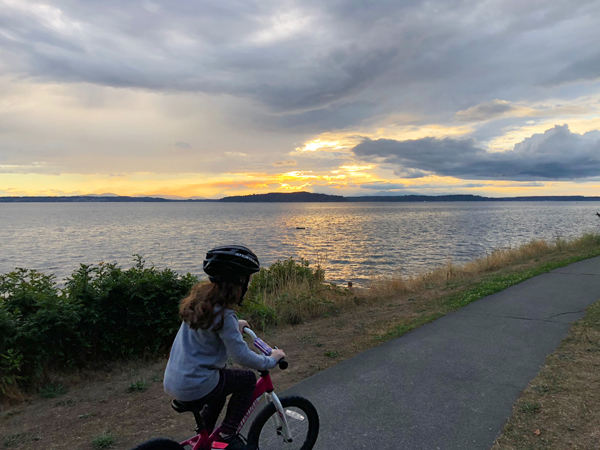 Juliette’s not quite solid enough on the bike to bomb down the extra-hilly streets near our house, so when she wants to get out for a legit ride we head down to the flat, scenic waterfront. Lincoln Park at sunset is A++ (even in the smoke).