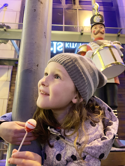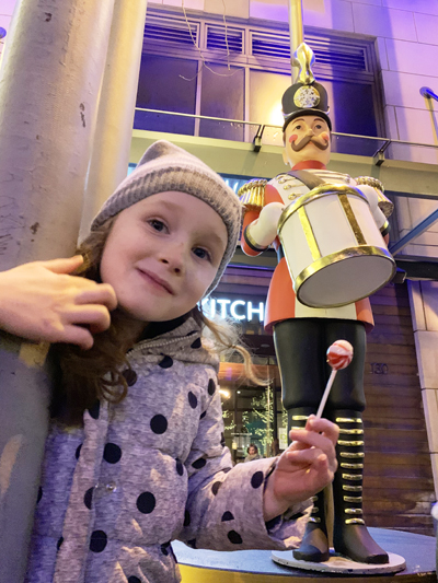Juliette and I kicked off our holiday break on the 21st with our annual Mama-Jules Downtown Christmas, where we spun through the city to see the sights. I let Juliette set the agenda and lead the way – her first request was the Fairmont’s life-size gingerbread house, where she asked if she could please lick the candy cane window trim. (I mean, she was setting the agenda, but…NO!!!)
