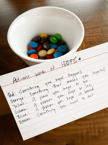 I saw something on Instagram at Thanksgiving about using M&M’s and a cue card to play a game of gratitude and we did something similar during the week of Hope, each of us picking an M&M from a bowl after dinner and using this card to share some of our deepest (or lightest!) hopes.