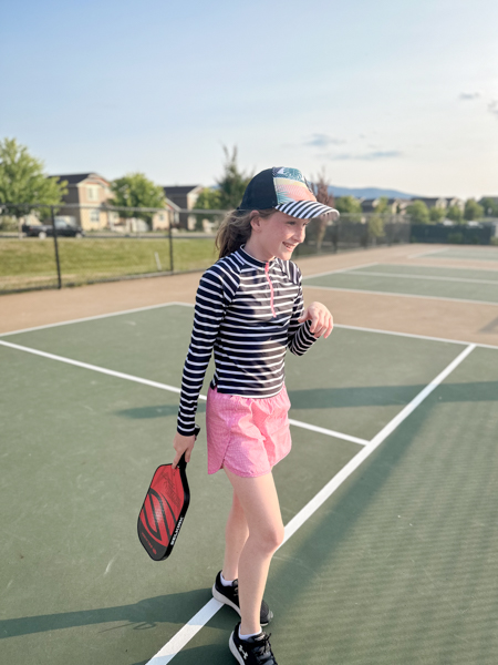 We spent the evening at yet another playground (so many to choose from!), though this one scored extra points for a splash pad plus pickle balls courts. Juliette feels like the special-est kid on the planet when Shane’s able to take the time to coach her on her dink game.Â