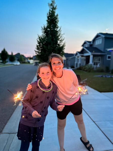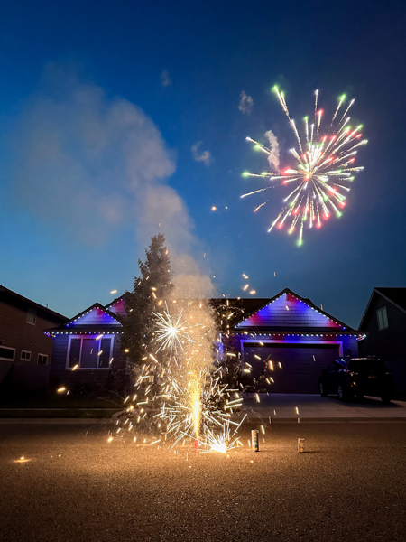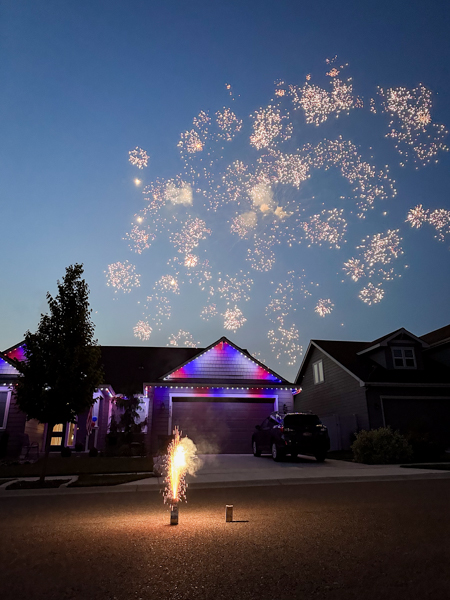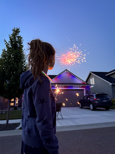 My dad, Juliette and I took a walk through the neighborhood as dusk fell – kids ran through the streets with sparklers and dads started hauling their arsenal of explosives out into their driveways.