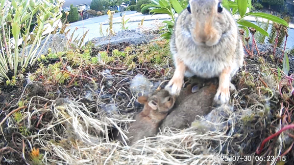 Shane set up a bunny cam as I’d seen no sign of mama and feared I’d scared her away with my poking around. But early the next morning we got a motion notification and there she was! Giving them breakfast and then tucking them back in.