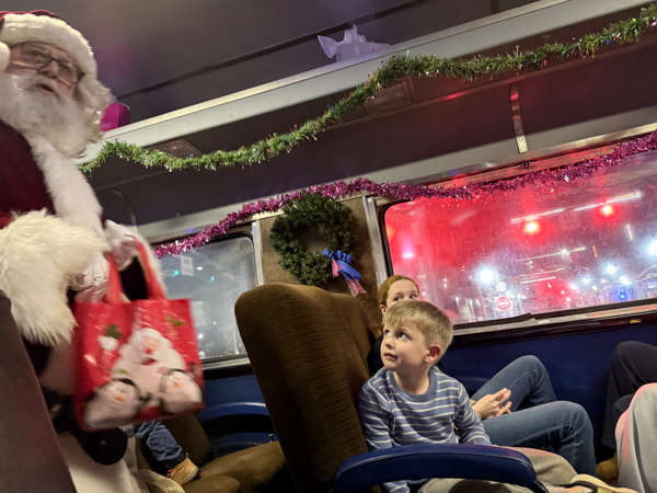 We settled into our seats and the kids cousin-ed around as the train left the station. We soon heard excited murmers from the back of our car…”Santa is coming!” Isaac turned around excitedly: