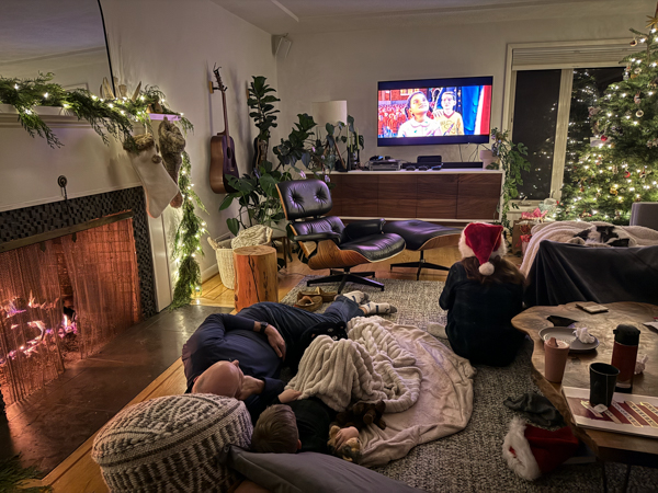 Finally, finally, after the movie was finished and cookies were set our for Santa and Christmas Mouse was read aloud, the youngest kiddo was tucked in for the night. Juliette lingered on the couch past 10pm, at which point I shooed her to bed. The Santa jig is obviously up with this girl, but still, it just doesn’t feel right to let her see me hang the stockings and set out gifts labeled “From Santa”. There’s something to be said for still pretending.